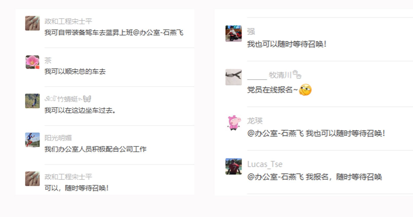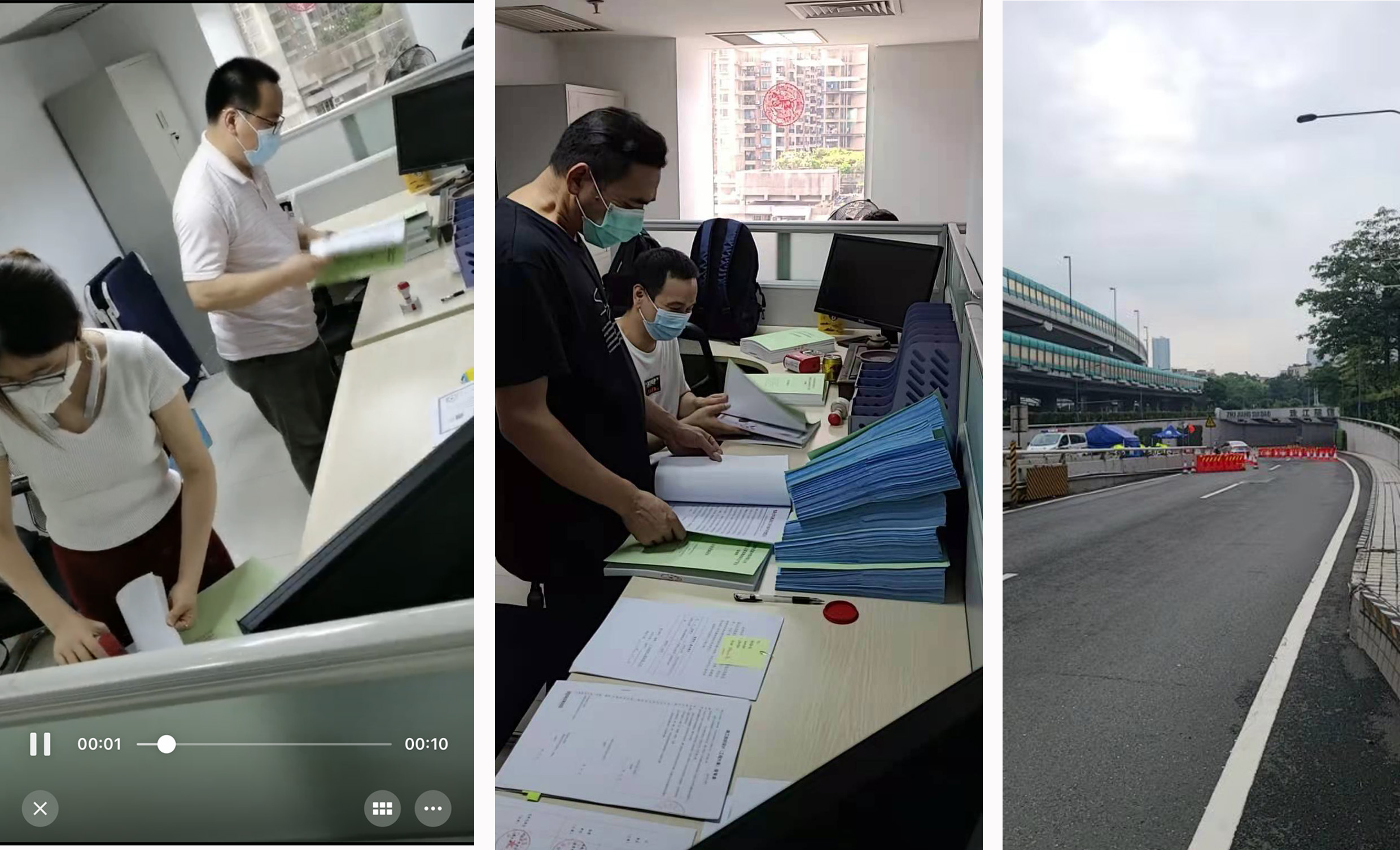 由于辦公大廈出現疑似病例,5月29日突然被封,公司預感事態嚴重,馬上成立疫情指揮應急小組,出臺緊急應對措施,一方面通知大家做好居家辦公準備,二是尋求臨時對外辦公點,并組織有條件出行的員工輪值上班,在“活力政和”群里,無論是共產黨員、優秀員工骨干或是普通員工都踴躍報名表示參加,紛紛回復“我可以”“隨時等待召喚”“在線報名”等。公司“臨時辦公點”也隨著疫情的蔓延和防控要求不斷變換,從海珠區的藍昇分公司轉移到越秀的醫藥分公司,最后輾轉到中山分公司,堪稱游擊戰術與疫情捉迷藏。期間6月3日下午,芳村地區開始封城,公司臨時辦公點的值班點人員在回家路上受到路況限制,在重重關卡中經多次繞道才得以回到家中。