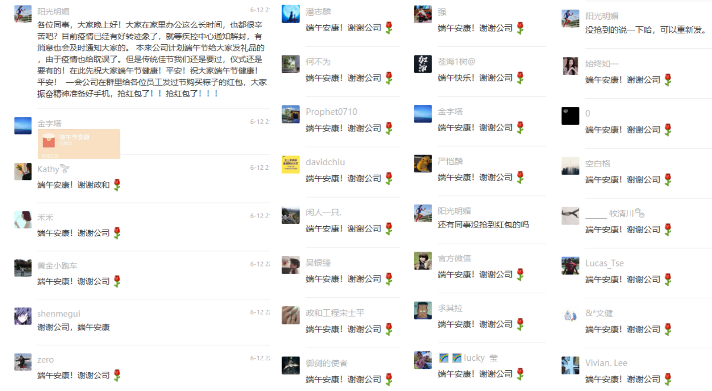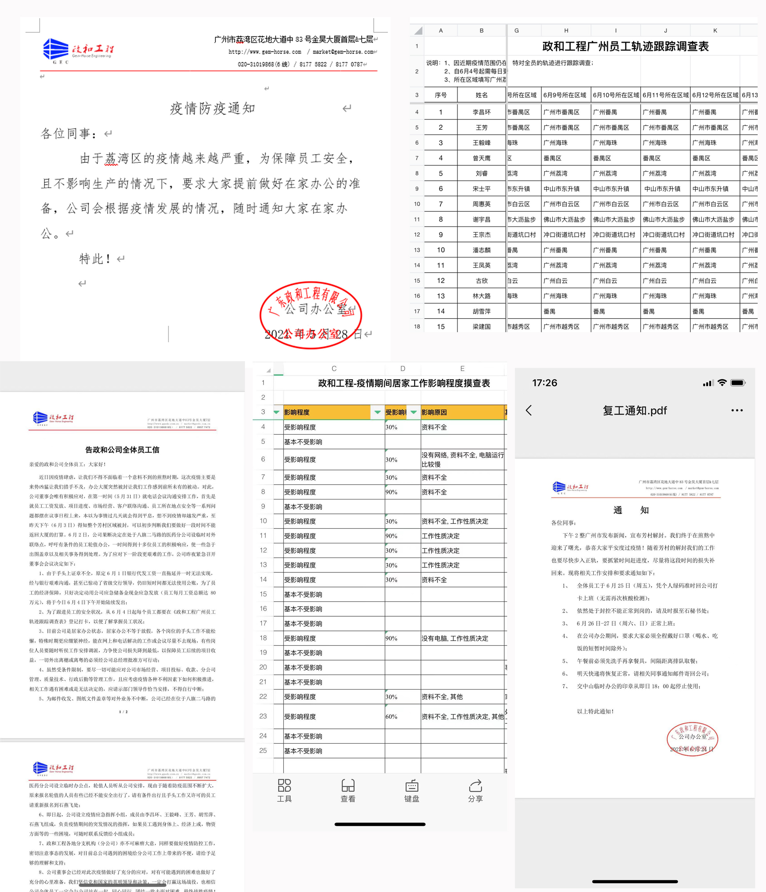 公司疫情指揮應急小組在防疫期間,先后發出了“居家辦公通知”“告全體員工信”“廣州員工軌跡跟蹤記錄(每天)打卡表”“員工疫情期間工作及工作影響表”“分發端午節紅包”“復工通知”等文件通知,有條不紊地對各項工作進行布置,安撫員工心情和思想動態,關心員工行蹤的安全,直至疫情結束。